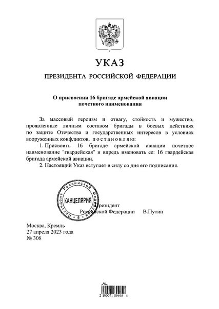 Указ Президента Российской Федерации от 27.04.2023 № 308 «О присвоении 16 бригаде армейской авиации почетного наименования»http://publication.pravo.gov.ru/Document/View/0001202..