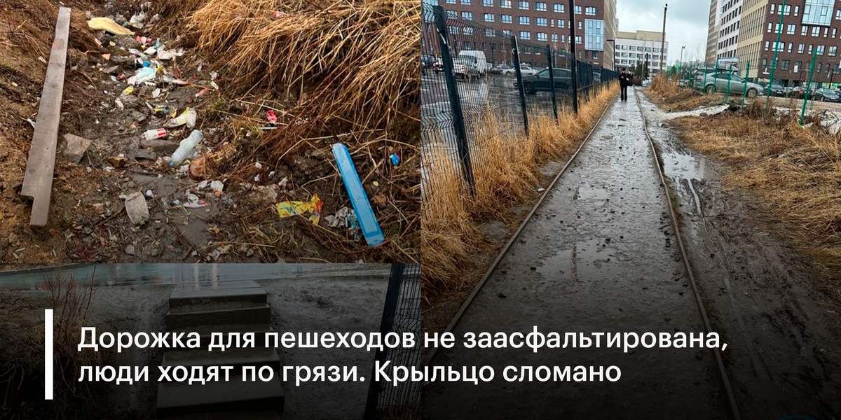 Дорожка для пешеходов не заасфальтирована, люди ходят по грязи. Крыльцо сломано