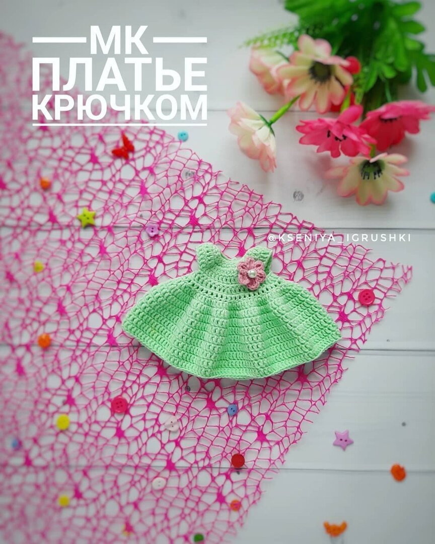 Закончите вязание, спрячьте все ниточки. Осталось пришить пуговицы и украсить платье. Можно сделать поясок из атласной ленты, продев ее между ссн. Приятного вязания и ровных вам петелек, мои дорогие