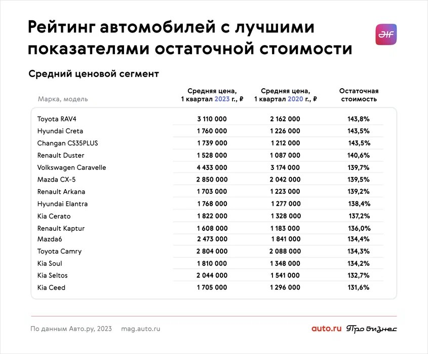 На днях я уже рассказывал о том, какой бюджетный автомобиль, спустя несколько лет аккуратного владения, можно продать дороже, чем он был в момент покупки. Сегодня — рейтинг «выгодных» моделей среднего ценового сегмента. Аналитики сравнили цены на новые автомобили в I квартале 2020 года со средними ценами этих же модели на вторичном рынке через 3 года владения. В исследование не попали машины после такси или сервисов аренды, более чем с двумя владельцами, а также после серьёзных ДТП. Как и среди недорогих машин, лидером лидерами по сохранению (а точнее приумножению) остаточной стоимости стали в основном наиболее продаваемые и популярные в России модели. Эксперты отмечают, что в этом ценовом сегменте — небольшое доминирование кроссоверов: цены на них «сохранились» лучше, чем на «легковушки». Как отмечают аналитики портала Авто.ру, один из факторов, почему многие модели бюджетного и среднего ценовых сегментов оказались настолько дороже, чем в момент покупки, — их высокая популярность и