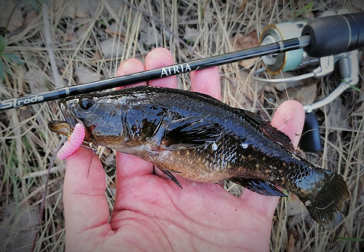 Вода малой реки опустилась, но еще мутная, ловить на реке можно только спиннинговой мормышкой, о которой мы расскажем в следующий раз. А пока можно заняться другой экзотикой – ловлей ротана на искусственные приманки. В очередной раз отмечу невероятную атмосферу компактных пойменных озер. По берегам высокие деревья, ветру разгуляться негде, ловить в любую погоду комфортно. Даже небольшой дождь не помеха. Птички летают и щебечут, листва распускается – красота!.. «Форелевый» маггот даже без огрузки летит далеко и точно. Приводнение, пауза, 2-3-4 подергивания и пауза, на которой приманка тонет. Длительность паузы сообразуем с глубиной в данной точке. Сначала проводим под самой поверхностью воды, с каждым забросом увеличиваем паузы, пока не начнем цеплять траву. Особое внимание к местам с затопленными кустами – с одной стороны, там всегда держится рыба, с другой – зацеп за куст грозит неминуемым обрывом – шнур тонкий, всего 0,3 РЕ. Логично использовать специальные крючки с лесочной защитой,