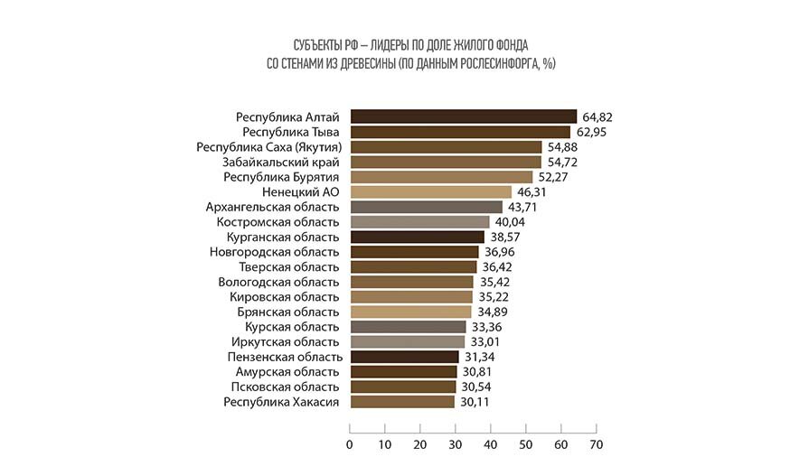 Определен и самый «деревянный» регион России – это Республика Алтай. Там деревянные жилые постройки составляют около 65 % от общего количества жилья. На втором месте находится Республика Тыва (свыше 62 %), на третьем – Республика Саха (Якутия), где почти 55 % жилого фонда составляют дома из дерева. В Забайкальском крае и в Республике Бурятия доля жилья из дерева тоже превышает половину от общего объема жилого фонда. Будем надеяться, что со временем к этим регионам подтянуться и другие. Сейчас в нашей стране работает более 500 крупных компаний, которые так или иначе занимаются производством сборных деревянных домов. Больше всего предприятий индустриального деревянного домостроения действует в Вологодской области.