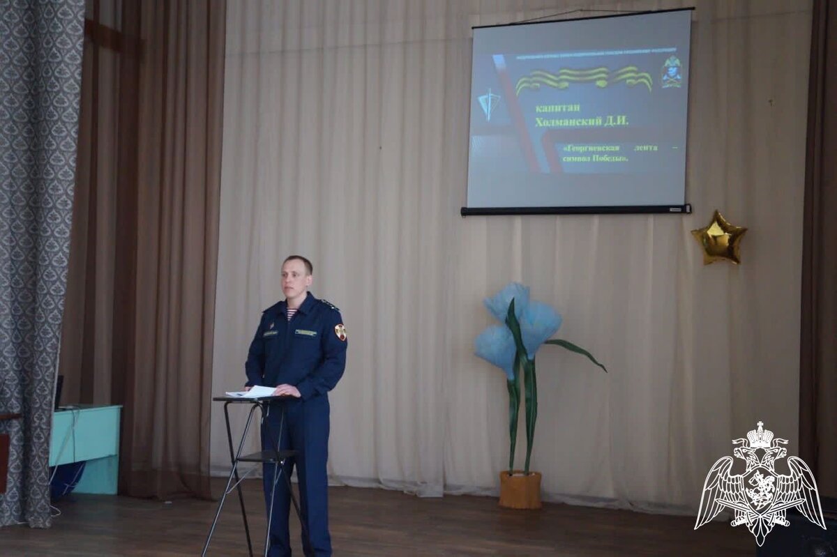 В МОУ "СОШ с. Генеральское им. Р.Е. Ароновой" Саратовской области военнослужащий отдельной авиационной эскадрильи Приволжского округа Росгвардии провёл Урок мужества для учеников младших классов, который был организован в рамках патриотического воспитания приуроченный к празднованию Дня Победы. Капитан Дмитрий Холманский рассказал ребятам об основных датах Великой Отечественной войны, а также особое внимание уделил символу Победы - Георгиевской ленточке. Так ребята узнали, что Георгиевская лента имеет смысловую символику. Её цветовое исполнение — чёрный и оранжевый цвет — означают «дым и пламя», характерные для военного времени, и олицетворяют подвиг русского воина на полях сражений, в тылу и на передовой. На протяжении всего урока дети внимательно и с интересом слушали росгвардейца.