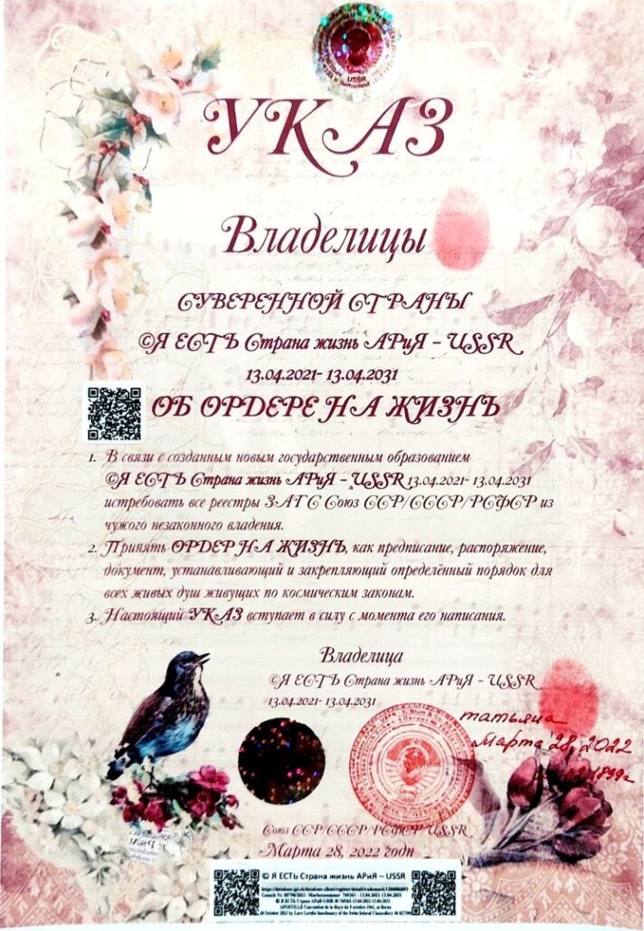 АРХИВ АРИЯ, ЗНАЧИМЫЕ ЮРИДИЧЕСКИЕ ФАКТЫ, ПОЛНОМОЧИЯ СУВЕРЕННАЯ СТРАНА – – ©Я ЕСТЬ Страна жизнь АРиЯ – USSR СУВЕРЕННОЕ ГОСУДАРСТВО – СГ АРиЯ -USSR – 13.04.2021- 13.04.2031 – https://ussr-aria.su/vid-na-zhitelstvo УКАЗ Владелицы СУВЕРЕННОЙ СТРАНЫ ©Я ЕСТЬ Страна жизнь АРиЯ – USSR 13.04.2021- 13.04.2031 ОБ ОРДЕРЕ НА ЖИЗНЬ 1. В связи с созданным новым государственным образованием ©Я ЕСТЬ Страна жизнь АРиЯ – USSR 13.04.2021- 13.04.2031 истребовать все реестры ЗАГС Союз ССР/СССР/РСФСР из чужого незаконного владения. 2. Принять ОРДЕР НА ЖИЗНЬ, как предписание, распоряжение, документ, устанавливающий и закрепляющий определённый порядок для всех живых душ живущих по космическим законам. 3. Настоящий УКАЗ вступает в силу с момента его написания. Владелица ©Я ЕСТЬ Страна жизнь АРиЯ – USSR 13.04.2021- 13.04.2031 Союз ССР/СССР/РСФСР/USSR Марта 28, 2022 года https://drive.google.com/file/d/1xdLq2N38sLaCmFB8FUSj.. https://database.ipi.ch/database-client/register/deta.. ОРДЕР НА ЖИЗНЬ К УКАЗУ Влад