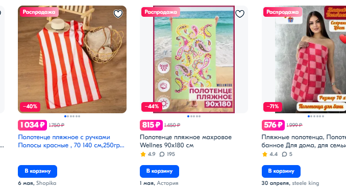 Заходим на OZON. К примеру, я как обычный человек просматриваю первые 10 страниц и нахожу свою любовь- полосатое полотенце для пляжа за 1034 руб. с сумасшедшей скидкой (на самом деле нет).