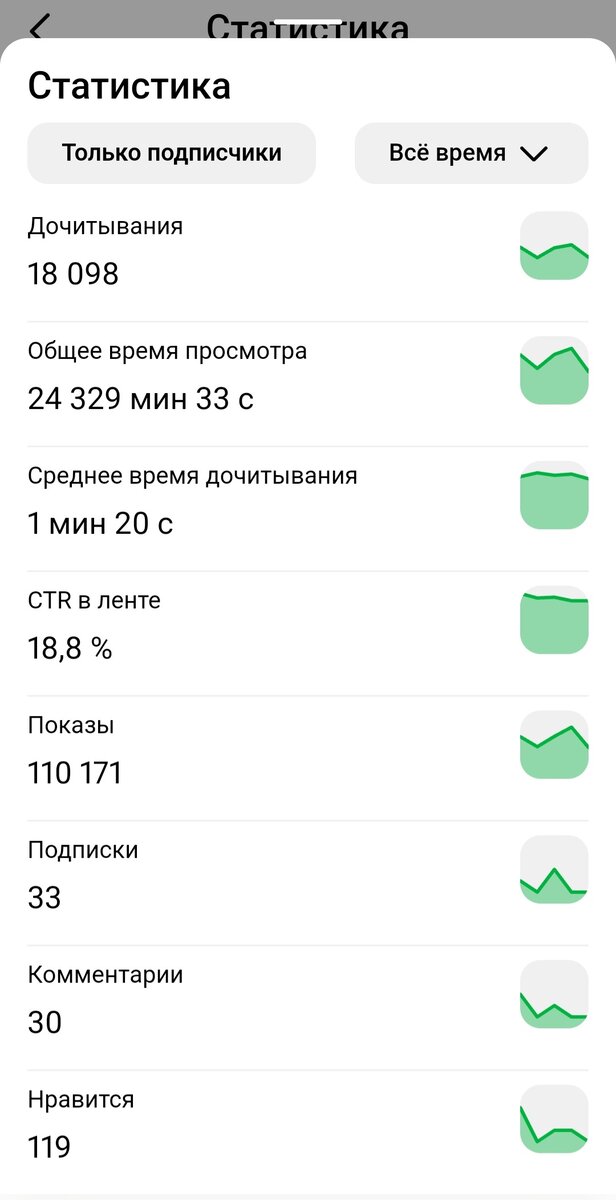 Как опытный блогер я знаю примерные алгоритмы, чтобы статья или рекламный материал "взлетели". Обычно это совокупность самых разных факторов: Но даже меня иногда удивляет какие статьи выходят в топ просмотров. У меня есть средний CTR в районе 10%, ниже которого совесть и опыт не позволяют опускаться. Отличный результат. Иногда что-то взлетает выше, иногда чуть ниже. Но вот эта статья до сих пор бьёт все рекорды прочитывания. Неделю расплачиваюсь только наличными. Любопытный результат Что в ней такого особенного, скажите? Тема, конечно, интересная, но чтобы каждый день столько просмотров. CTR 18.8% Карта дочитывания 86%. Более 400 часов прочтения. 17 дней люди читали и продолжают читать эту статью. Круто! Монетизируется это всё ещё не кратно просмотрам🤭, но я верю в себя и в дзен) Такой высокий показатель просмотров и дочитывания очень вдохновляет продолжать заниматься блогом. Благодарю вас, читатели. Подписывайтесь, обещаю радовать интересными статьями и видео.