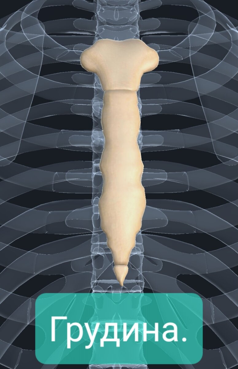 Плоская губчатая кость, расположенная на передней поверхности грудной клетки. Располагается поверхностно, над ней нет мышц - поэтому она на всем протяжении легко прощупывается. К грудине через свои хрящевые части крепятся 10 пар рёбер (первые 7 пар напрямую, еще 3 пары через хрящевые части седьмой пары). Также с грудиной связаны мышцы: большие грудные, диафрагма, грудинно-ключично-сосцевидная, поперечная мышца груди, прямые мышцы живота - для каждой из них грудина является одной (но не единственной)из точек крепления (или начала). Грудина имеет три основные составные части: В верхней части рукоятки грудины находится ярёмная вырезка - костное основание ярёмной ямки шеи (углубления внизу посередине шеи, между ножками грудинно-ключичной мышцы). По бокам от ярёмной вырезки располагаются ключичные выямки - правая и левая (суставные поверхности грудинно-ключичных суставов). Под ними - рёберные вырезки (места соединения с хрящевыми частями первой пары рёбер. Рукоятка грудины соединяе