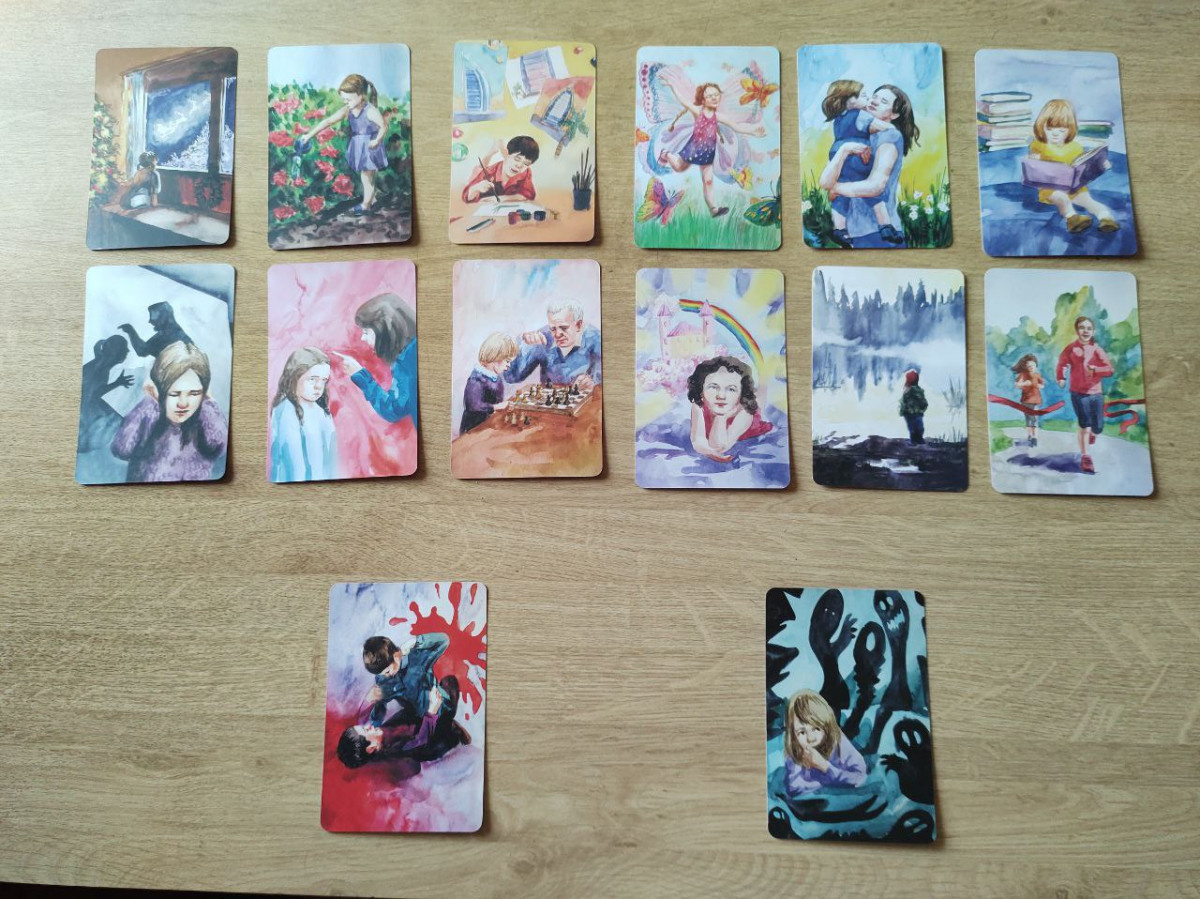 Жанна выбирает из колоды карточки, которые отражают ее состояние. 12 карточек посвящены чувствам, связанным с ее детсвом и пребыванием на родной даче. Здесь есть место детским сказочным мечтам, выращиванию цветов, творчеству, свободе, объятиям, чтению книг. Иногда случаются ссоры между родителями, иногда мама ругает дочку, и та чувствует себя виноватой (это похоже и на нынешнюю ситуацию, ведь мама обвиняет Жанну, что та соглашается ехать с мужем на дачу к свекрови). Жанна вспоминает игру с дедушкой в шахматы, радугу и походы на речку, и как она занималась спортом, бегая с папой.