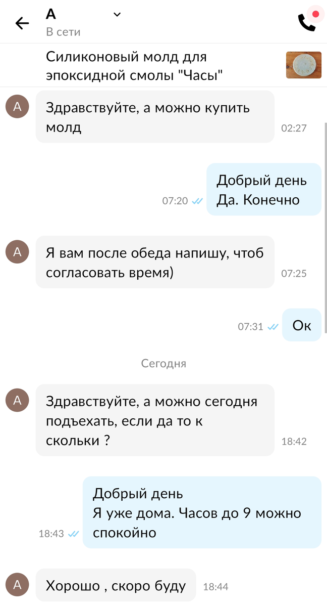Не перестаю удивляться людям на Авито и казусам, которые случаются на этой площадке. Вот и недавно у меня случился ну очень забавный диалог. Но если посмотреть с другой стороны, то не было ли это издевательством? Молд на продажу Уже достаточно давно я выставила на продажу молд. С его помощью можно изготовить из эпоксидной смолы или гипса часы. Подобные молды не редкость, их можно легко заказать на OZON или AliExpress. Стоят они по-разному. Иногда их можно выцепить дешево, иногда нет. Я выставила свой за 300 рублей, то есть чуть дороже, чем за 50% от цены нового. Получается, что заказывать молд с доставкой в другой регион может быть экономически не выгодно. Этот молд провисел у меня достаточно долго, а потом мне написала девушка и спросила, можно ли его купить, может ли она сегодня вечером приехать за ним. Я посмотрела ее профиль и удивилась, сама девушка явно из Питера, все свои товары она продает там. Как она вдруг собралась приезжать ко мне в Москву? Далее диалог прекратил развиватьс