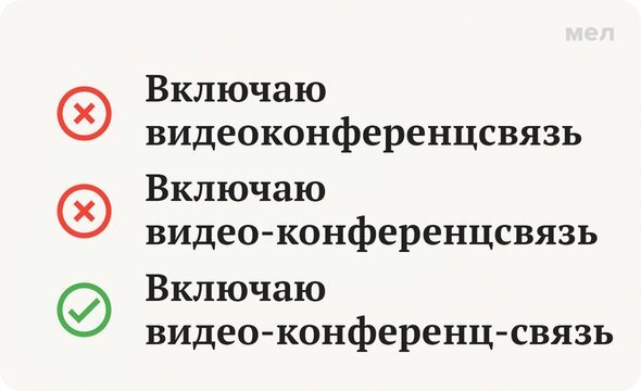 Понятный всем разговорный оборот «выйдем в зум» в официальных документах порой все еще называют видео-конференц-связью. Как, кстати, думаете, мы правильно сейчас написали это слово? Правильно: видео-конференц-связь Чтобы разобраться в написании этого сложного слова, нужно для начала разложить его на составляющие. Отдельное понятие «конференц-связь» в русском языке существует. И так как это сложное слово с несклоняемой первой частью, пишется оно через дефис. При этом сложные слова с первой частью «видео-» обычно пишутся слитно («видеоигра», «видеоролик»). Но слитное написание заменяется дефисным, если дефис есть во второй части слова. А это как раз наш случай. Написание «видео-конференц-связь» с двумя дефисами зафиксировано в 4-м издании академического «Русского орфографического словаря» под ред. В. В. Лопатина, О. Е. Ивановой (М., 2012). Ещё больше весёлых и полезных карточек о русском языке — в «Грамотности» на «Меле» во «ВКонтакте». Подписывайтесь, чтобы всегда говорить и писать прав