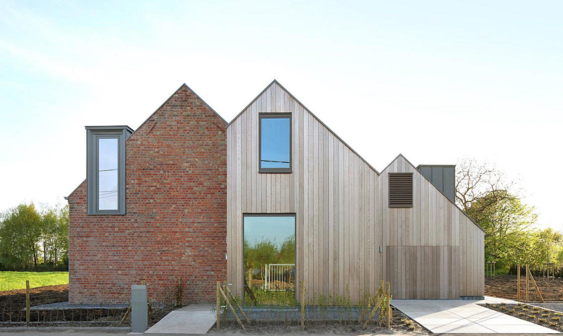 “Бывший фермерский дом расположен в сельскохозяйственном районе. Типология существующего здания была использована современным способом для расширения жилища. Мы добавили два новых объема со скатной крышей, соединенных с существующим объемом. Два световых люка в форме дымохода создают свет и открывают вид на первый этаж. В третьем дымоходе находится выход воздуха для теплового насоса. Старое и новое сотрудничают друг с другом, при этом оба остаются четко видимыми. Новые объемы отделаны деревом. При входе в дом ощущается старый кирпичный фасад. Новые лестницы напоминают о ранее существовавшей лестнице, которая была демонтирована. Контрфорсы и кирпичные полоски в полу покажут прежнюю планировку сарая. Двойная высота дома делает жилые помещения более просторными. Новая оцинкованная крыша, предварительно обработанная атмосферными воздействиями, соединяет здания в единое целое. В дополнение к замене старых столярных изделий новыми окнами, старый