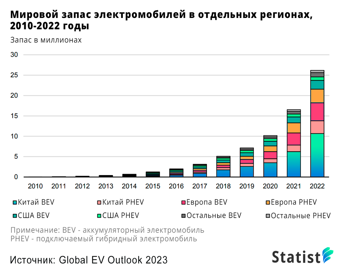 В 2022 году было продано более 10 миллионов электромобилей в мире, включая аккумуляторные и гибридные автомобили, работающие от электросети. Рост составил 55% по сравнению с продажами в 2021 году, и является новым рекордом для данного сектора. Согласно докладу Международного энергетического агентства (МЭА) о рынке электромобилей, ожидается, что продажи электромобилей продолжат расти и достигнут 14 млн в текущем году 2023 году. На данный момент в мире насчитывается более 26 млн электромобилей – это на 60% больше, чем в 2021 году. Самые крупные рынки для этого вида транспорта находятся в Китае, Европе и США, поскольку на эти страны приходится 95% всех продаж в мире в 2022 году. Китай лидирует с долей продаж 60% в 2022 году. Сейчас в Поднебесной насчитывается более 13,8 млн – это более половины всех существующих электромобилей. В Европе, которая является вторым по величине рынком электрокаров, продажи выросли на более чем 15%, было продано 2,7 млн автомобилей за год. В отличие от предыдущ