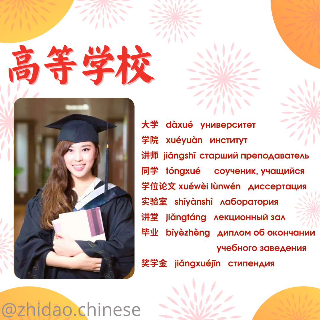 #zhidao_подборка_слов Тема: вуз (高等学校 gāoděng xuéxiào) 👨🎓 🔸大学 dàxué университет 🔸学院 xuéyuàn институт 🔸讲师 jiǎngshī старший преподаватель (читающий лекции) 🔸同学 tóngxué соученик, однокашник; учащийся; студент 🔸学位论文 xuéwèi lùnwén диссертация 🔸实验室 shíyànshì лаборатория 🔸讲堂 jiǎngtáng лекционный зал, аудитория 🔸毕业证 bìyèzhèng диплом об окончании учебного заведения 🔸奖学金 jiǎngxuéjīn стипендия 📝 Ссылка на карточки Quizlet для изучения новых слов: https://quizlet.com/_d6qrqq?x=1jqt&i=2r5snr ❗В Quizlet вы можете послушать произношение всех слов! Для этого в различных режимах изучения или при просмотре списка слов нажмите на значок микрофона 🔊 📚 Хотите, чтобы Вы или Ваш ребенок заговорили на китайском? Напишите нам для записи на групповые / индивидуальные занятия! 🎓