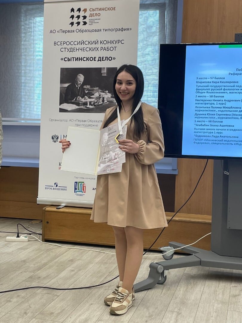 В Москве состоялось торжественное награждение победителей Всероссийского конкурса студенческих работ «Сытинское дело» сезона 2022–2023 года. На конкурсе были представлены работы молодых исследователей истории и практики книжного дела и просветительской деятельности русского предпринимателя и книгопечатника Ивана Сытина, его вклада в развитие медийной отрасли России. Магистрантка Высшей школы печати и медиатехнологий СПбГУПТД Элина Агабабян представила на конкурс авторскую работу под названием «Просветительство как социальное предпринимательство: продолжение традиций И. Д. Сытина в современном издательском деле» и заняла 1-е место в номинации «реферат, статья, журналистский очерк». Элина пополнила свое портфолио дипломом победителя и памятной медалью конкурса.