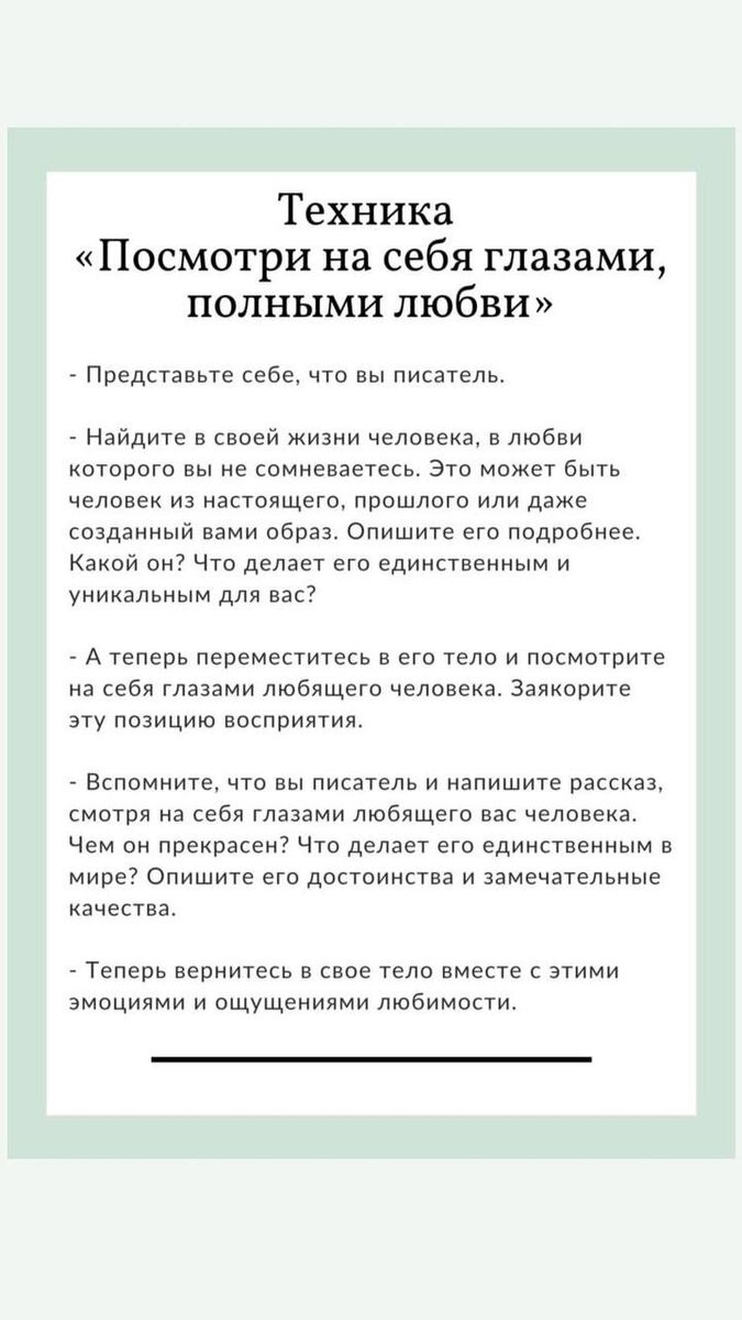 Как полюбить себя? 1. Принимайте себя таким, какой вы есть, со всеми своими достоинствами и недостатками. 2. Уделяйте время уходу за собой, заботьтесь о своем теле и здоровье. 3. Занимайтесь тем, что вам нравится и что приносит вам удовольствие. 4. Научитесь прощать себя за ошибки и неудачи, не держите зла на себя. 5. Окружайтесь людьми, которые вас поддерживают и признают вашу ценность. 6. Не сравнивайте себя с другими, не стремитесь быть кем-то другим, будьте сами собой. 7. Признавайте свои достижения и успехи, даже если они кажутся маленькими. 8. Занимайтесь саморазвитием, учите новое, расширяйте свои горизонты. 9. Говорите себе добрые слова, не критикуйте и не обзывайте себя. 10. Практикуйте благодарность, умейте ценить и радоваться тому, что есть в вашей жизни.