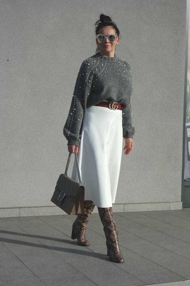 - Безупречная классика – белая юбка из четырех клиньев, модель имеет слегка расклешенный силуэт, длина юбки достаточна, чтобы прикрыть верхнюю часть сапог с рисунком под кожу рептилий. К юбке добавили серый джемпер, украшенный на рукавах и в верхней части бусинами. Джемпер заправлен за пояс, линия талии выделена ремнем.