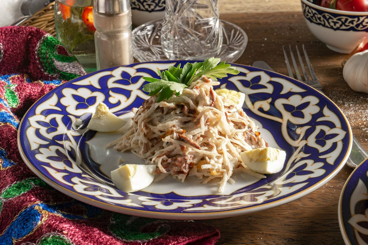 Говоря про сегодняшнее блюдо, первое, что хочется сказать: не верьте тем, кто сказал, что это исконно узбекское блюдо и родина его Узбекистан. Нет, это не так! Блюдо это появилось в Москве в советские годы по случаю открытия первого ресторана узбекской кухни и назывался он сначала "Узбекистан". Перед поварами встала интересная задачка: сделать блюдо, которое понравится москвичам и будет в себе сочетать узбекские мотивы. Для понимания концепции блюда разберем его состав. Ташкентский салат обычно делают из редиса или зеленой редьки, лука, отварной или запеченной говядины/баранины, зелени, майонеза и яиц, которые все порезаны в мелкую соломку.