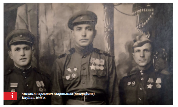 Мой прадедушка, Михаил Сергеевич Мартынов (17.09.1908 – 27.05.1976), был мобилизован в ряды Красной армии в декабре 1941 года Чебаркульским РВК Челябинской области, прошёл обучение наводчиков артиллерийских орудий и с марта 1942 года воевал на фронтах Отечественной войны в составе 80-го Артиллерийского полка 304 сд. ДонФ и 138-го Гвардейского артиллерийского полка 67 гв. сд. ВорФ, 2 УкрФ. Из своего дома в посёлке Бишкиль Чебаркульского района ему суждено было дойти до берегов Балтийского моря, где он и встретил победу в мае 1945 года, участвуя в боях с остатками германских войск группы армий «Север» в западной части Латвии. Демобилизован был только в ноябре 1945 года в Литве, в городе Каунас. Первую свою боевую награду, медаль «За боевые заслуги», Михаил Сергеевич заслужил в бою 30 ноября 1942 года за освобождение хутора Вертячий Сталинградской области. Хутор имел стратегическое значение в битве за Сталинград (напрямую до города оставалось всего 60 км), в боях за Вертячий погибло свы