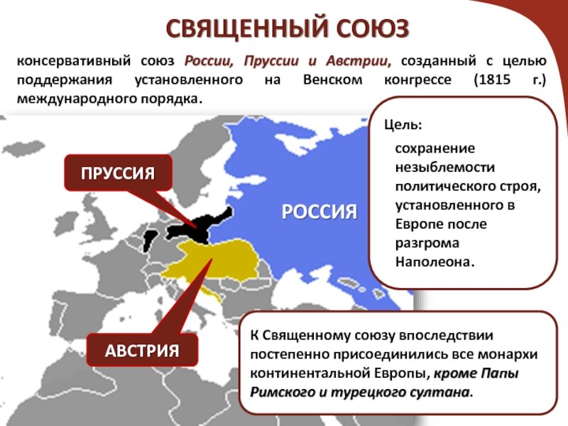 Победитель в войне, мучимый совестью из-за смерти отца, и жаждавший признания, самодержец всероссийский Александр I, ставший с возрастом более религиозным, создал союз из России, Австрии и Пруссии, именуемый Священным, к которому постепенно присоединились все государства Европы, кроме ..... Англии. своего рода Евросоюз, только под русской эгидой Александр I пригласил принца-регента присоединиться к договору, но английское правительство отнеслось к Священному союзу с подозрением, и заявило, что король и принц-регент по конституции не могут заключать подобные союзы.