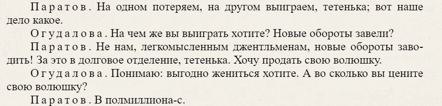 Мой любимый блог про кино - конечно же, "Эх прокачу". Недавно видел на нем заметку, которая основана на изначально неверном посыле. Тем и крут этот канал, что с каждой статьей можно согласиться, но можно и поспорить. Итак... Проглядел материал, и ничего не понял. Да, я знаком с текстом "Бесприданницы", и лет 30 назад буквально зачитывался томиком Островского, выучив многие пьесы наизусть. Действительно, была такая фраза у классика. И я кинулся пересматривать свой любимый "Жестокий романс". Паратов действительно говорит Огудаловой, что на одном проиграет, на другом выиграет. А в ответ на ее вопрос, "на чем же выиграть думаете", Сергеич уклончиво отвечает: "Я бы хотел засвидетельстовать свое почтение Ларисе Дмитриевне". Есть мнение, что Харита Игнатьевна всё поняла. Я с ним категорически не согласен. Так как фраза присутствует в пьесе Островского, то если бы Эльдар Рязанов хотел ее включить - непременно бы это сделал. Нет-нет, здесь всё было намеренно, это очередная гениальная задумка ве