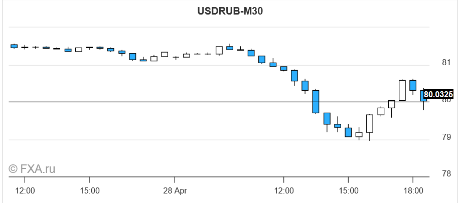 Сегодня ЦБ РФ принял решение сохранить ключевую ставку на уровне 7.5% годовых Минимальное значение на которое сегодня опускался доллар в ходе торгов на Московской бирже - 78.9512 Банк России сообщил, что инфляция в марте и апреле снизилась в несколько раз по сравнению с февралем, но при этом сохранил возможность повышения процентных ставок из-за инфляционных рисков. "Учитывая постепенно растущее инфляционное давление, на предстоящих заседаниях правления Банка России будет рассмотрена необходимость (а) повышения ключевой ставки для стабилизации инфляции вблизи 4% в 2024 году и далее", - заявил ЦБ РФ Также рубль укрепляется к доллару благодаря последнему дню налогового периода апреля, что приведет к большим продажам валютной выручки экспортерами.