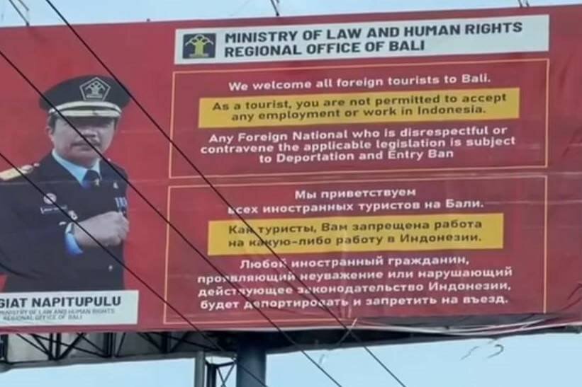 На Бали появились впечатляющие билборды на русском языке, которые предупреждают туристов о возможных последствиях работы в Индонезии по туристической визе. Важный текст также продублирован на английском языке. Местные власти разместили эти плакаты, чтобы обратить внимание на серьезность ситуации. Использование русского языка в дополнение к английскому связано с огромным количеством русских туристов на Бали. Власти отмечают, что если иностранец нарушает правила, его могут депортировать и запретить ему въезд. Ранее губернатор Бали предложил отменить упрощенный порядок получения виз в аэропорту по прибытии для граждан России и Украины в связи с многочисленными нарушениями ими индонезийского законодательства.