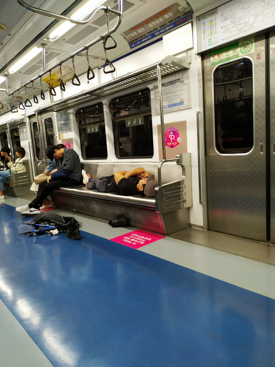 Что вам точно не понравится в Южной Корее? - Метро! В любой стране я обязательно считаю своим долгом попробовать прокатиться на местном метро - настоящую жизнь города, ее жителей, культуру можно и нужно смотреть и под землей. Так вот метро в Сеуле самое что ни на есть обычное, все серое, невзрачное, поезда стандартные - никаких там высоких технологий или повышенной комфортности. Да, управляются они не машинистами, а все движение автоматизировано - на этом, пожалуй, все супер технологии и заканчиваются. Карта-схема запутанная как паутина, только она вытянутая, сложная и поверьте, не раз и, может быть даже не два, вы будете путаться и пропускать свои станцию или даже ветку - есть направления где ожидаешь поезд в одну сторону, а он, почему-то, начинает ехать в другую. Даже корейцы, которые приезжают в Сеул из других городов, не сразу начинают ориентироваться в хитросплетениях сеульский линий метро с первой поездки. Вагоны обычные, похожи на наши старые советские вагоны метро, которые