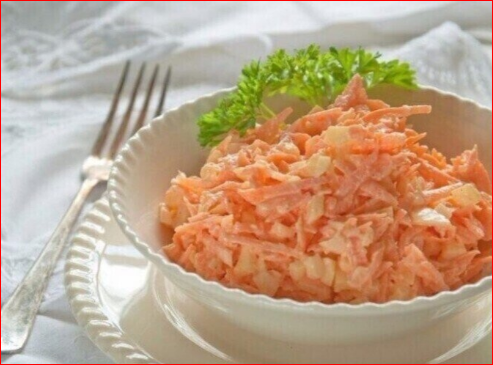 Этот салатик самый простой и универсальный. Его можно подать в качестве закуски, пикантного дополнения к основным блюдам, а ещё намазка для небольших закусочных бутербродов. Приготовление занимает считанные минуты. Как делать морковный салат "Огонёк" Берем сырую морковку. Отваривать не нужно. Трём на средней тёрке. Рекомендую именно среднюю, потому что на мелкой натереть, тогда в салате будет много жидкости, а если на крупной, то будет грубовато. Твёрдый сыр также трём на средней тёрке, но можно и на мелкой. Добавляем к морковке. Пропускаем через пресс чеснок. Добавляем с морковке с сыром. Солим и перчим по вкусу. Если есть свежая зелень, рекомендую мелко нарезать и добавить, она здесь будет кстати. Заправляем майонезом и хорошо перемешиваем. Выложив в салатник, украшаем веточками свежей зелени и подаем на стол. Количество ингредиентов: Дополнение к рецепту - твёрдый сыр можно заменить на плавленный - полтора сырка. С ним получается даже мягче и очень хорошо именно в качестве намазки д