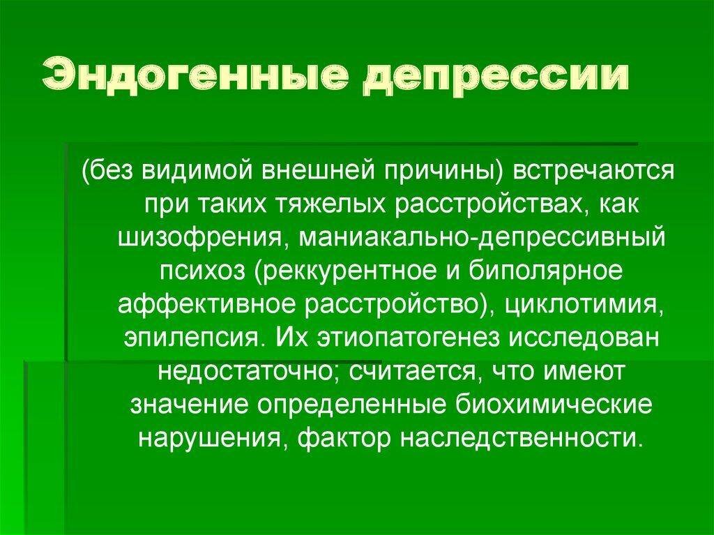 Эндогенная депрессия — это одна из самых тяжелых форм депрессии. Хотя существует множество различных типов, но эндогенная депрессия, является особенно сложной формой расстройства. В отличие от реактивных и прочих типов депрессии, вызываемой внешними событиями и обстоятельствами, эндогенная, не имеет видимой причины. На ее появление влияют несколько факторов: