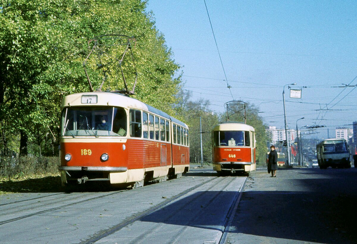 Один из наших читателей поделился двумя интересными историческими снимками московского трамвая. Первый снимок сделан в Москве на проспекте Мира в 1977 году. На фото мы видит чехословацкие "Татры". Вагон справа одиночный, из первых годов выпуска, на снимке видны горизонтальные задние фонари. такие трамваи имели узкий маршрутный указатель, но в зависимости от года выпуска имели отличие в лобовом стекле (цельное или разделенное перегородкой), форточках на окнах. Слева еще более интересный вагон. Сочлененный трамвай "Татра" К-2. Вагоны данного типа в СССР не были распространены, так как не прижились, за исключением Харькова, где они дожили на самого начала 1990-х годов. В Москве трамваев-"гармошек" было всего 60 единиц. Поступали они в 1967-1969 годах. Второй снимок сделан на Климентовском переулке тоже в 1977 году. На снимке можно увидеть двухдверную "Татру" уже с вертикальными задними фонарями, более привычную для нас. С уходом с московских линий последних "Татр" данные снимки являют