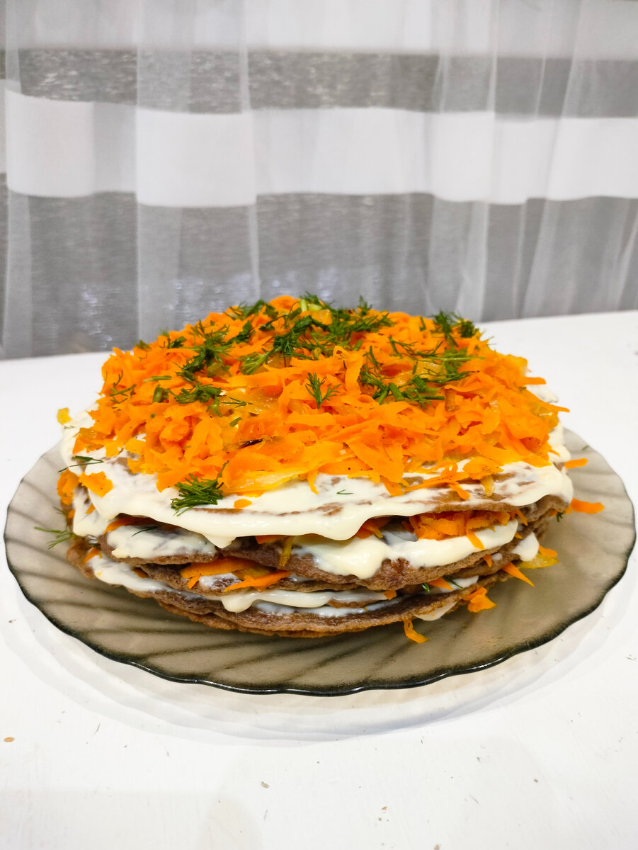 Печеночный торт - сытное и вкусное блюдо, разнообразит как повседневный, так и праздничный стол! Приготовьте по этому несложному рецепту и комплименты вам и вашему столу обеспечены! Нам понадобится: печень куриная - 600-700г яйцо -1 шт Мука - 60 г Майонез или сметана - 2 стол ложки Лук репчатый - 250 г Морковь - 350 г Для смазывания: Майонез - 150 г Чеснок - 2 зубчика Петрушка или укроп - 1/2 пучка Соль, перец - по вкусу Масло растительное - для обжаривания Приготовим сначала начинку для наших блинчиков. Морковь натереть на терке, лук нарезать тонкими полукольцами. Обжарить, посолить, поперчить. Далее пожарим печеночные блины. Для теста возьмем печень, промоем, уберем пленки и прожилки, перемелем блендером. Добавляем яйцо, солим, перчим, кладем майонез, все мешаем, добавляем муку, перемешиваем. На раскаленной сковороде жарим печеночные блины. Каждый блин необходимо жарить по 1-2 минуте. В итоге получается 6-7 блинов. Даем им остыть. В это время приготовим соус, которым будем смазывать