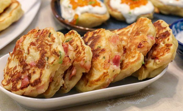 Оладьи получаются настолько пышными, что больше напоминают маленькие пирожки. Особенно, если добавить к тесту рубленый зеленый лук и мелко нарезанный подкопченный бекон. Оладьи с начинкой можно есть и горячими, и остывшими. Будет вкусно.