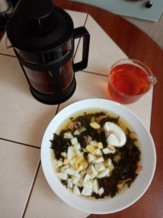 На обед захотелось лёгкого супчика. Правда, сегодня готовила и для себя, и для мужа, поэтому есть небольшие нарушения. Бульон на свиной косточке (совсем без жирка) сварила, мясо отделила. Бульон лёгкий - косточка небольшая, но вкус мясной. В бульон добавила одну картофелину (нарушение!), мясо, которое с косточки, замороженную свекольную ботву, лавровый лист, зелёный лук. 5 минут прокипятила, и готово. Вместо свекольной ботвы можно щавель или молодую крапиву, но я её не люблю. И со щавелем вкус чуть другой. Со свекольной ботвой люблю больше всего. Живу в селе, замораживаю на зиму. В тарелку добавляю сметану и варёное яйцо. Напиток: сушёная груша, несколько ягод шиповника и клюквы, сахарозаменитель, кипяток. Настоялось, и можно пить. Больше общения и рецептов - в группе "Рецепты для диабетиков" в ВКонтакте! Рецепт на странице Автор рецепта – Ирина Мартынюк