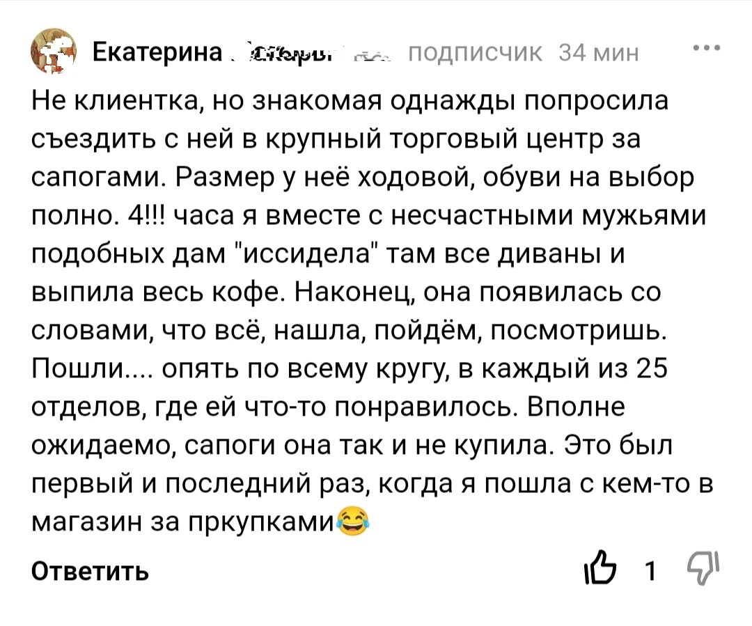 Многие люди имеют конфликты на фоне сопровождения за покупками со своими близкими или друзьями. Я и сама оказывалась пару раз в подобной ситуации на стороне комментирующего: Это комментарий на моем канале, но, думаю, его содержание откликнется очень у многих! Кто-то так засиживал диваны и по 6-8 часов. Особенно, если предстоит важное событие. Когда не знаешь, чего хочешь, очень сложно что-то выбрать и "глаза разбегаются"! Однако, считаю, что многие вещи вообще лучше всего покупать в одиночестве. А показать кому-то фото сейчас не проблема. Прислать прямо из примерочной или потом продемонстрировать. Во-первых, ты и сам на это посмотришь со стороны, во-вторых, никого не измучаешь :) Иногда достаточно взглянуть на фото, сразу видно изъяны товара, если они есть, которые в зеркале разглядеть сложнее. Если только вы не хотите провести с кем-то время в тц, и просто гуляете по магазинам, но не часами :) А потом заходите насладиться вкусняшками и беседой :) Скажу вам честно, я и мой мужчина не п