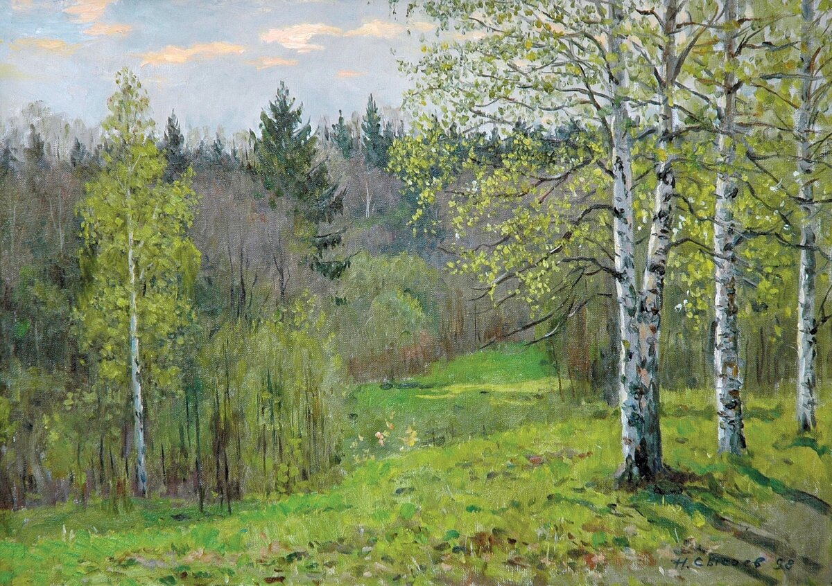 Осветив черепицу на крыше И согрев древесину сосны, Поднимается выше и выше Запоздалое солнце весны. В розовато-коричневом дыме Не покрытых листами ветвей, Весь пронизан лучами косыми, Бьет крылом и поет соловей. Как естественно здесь повторенье Лаконически-медленных фраз, Точно малое это творенье Их поет специально для нас! О любимые сердцем обманы, Заблужденья младенческих лет! В день, когда зеленеют поляны, Мне от вас избавления нет. Я, как древний Коперник, разрушил Пифагорово пенье светил И в основе его обнаружил Только лепет и музыку крыл. Художник: Сысоев Николай Александрович (1918 - 2001) #стих #стихи #литература #поэзия #искусство #культура #искусство #литература #музыка #пейзаж