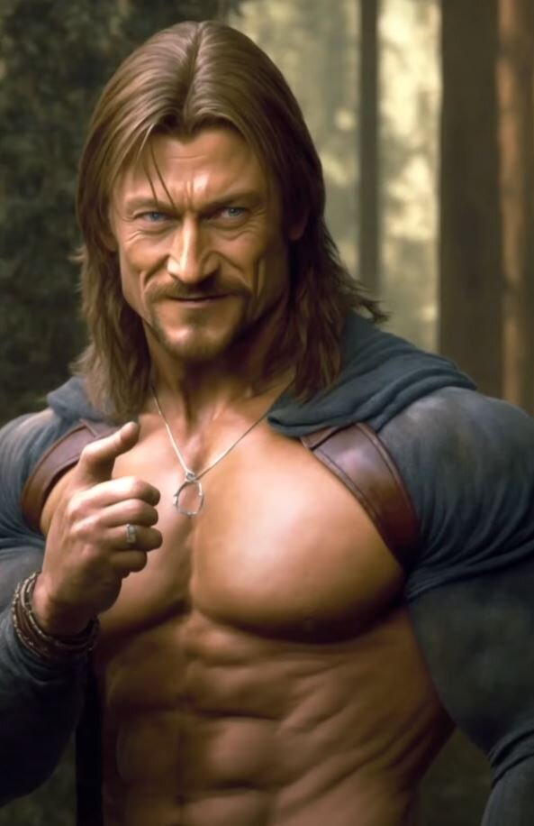 Приветствую всех поклонников творчества Толкина. Добро пожаловать в мир Midjourney! Нейросеть продолжает радовать нас весьма качественными артами из мира фэнтези. На этот раз ИИ сгенерировал образы знаменитых персонажей, если бы они много времени проводили в тренажерном зале. Приятного просмотра. Начнем с Боромира. Веселый здоровяк с Кольцом на шее. Видимо, ему все-таки удалось отобрать его у Фродо (или обменять на протеин). Саруман уже не кажется таким уж хлипким магом, который все время уделяет изучению волшебства. Правда, последствия походов в качалку сказались - лишний палец на руке вырос. Обворожительная Тауриэль. Да, я знаю, что Джексон ее специально выдумал для своего "Хоббита", и что в книгах Толкина такого персонажа не было. Но все-равно достаточно симпатичная получилась, не находите? А это Леголас с квадратной челюстью. Интересно, в плане выносливости он остался все таким же? Как по мне, с такими мышцами по горам и лесам не особо-то и побегаешь. Саурон максимально суров. Крут