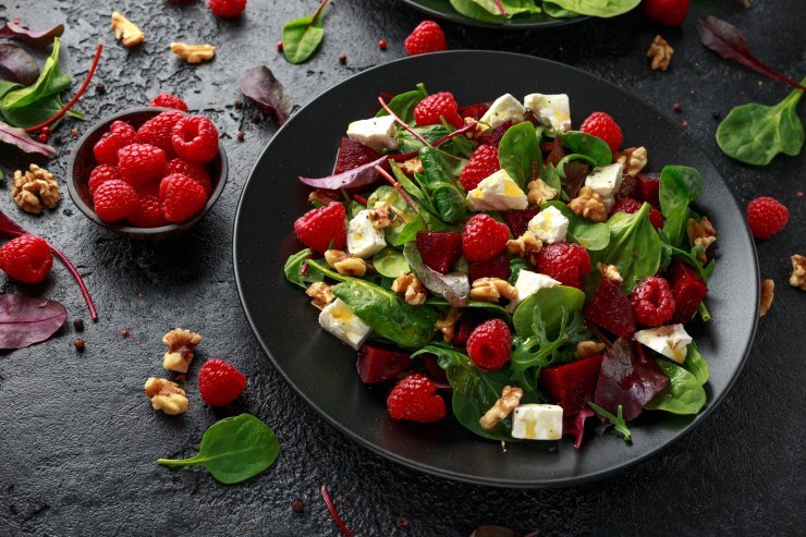 Салат с малиной и орехами – это прекрасное блюдо, сочетающее в себе разнообразные вкусы и текстуры. Малина и орехи придают сладость и хороший аромат, а листовой салат, руккола, огурец и помидоры создают основу для салата и придают свежесть и хрусткость. В целом салат с малиной и орехами - это идеальное блюдо для тех, кто любит экспериментировать со вкусами и ищет новые варианты для своего стола. Ингредиенты Рецепт приготовления Начните с мытья и сушки овощей. Разделите листовой салат на отдельные листики, рукколу – на веточки, огурец и помидоры – на кусочки или кубики. Поместите их в большую миску.