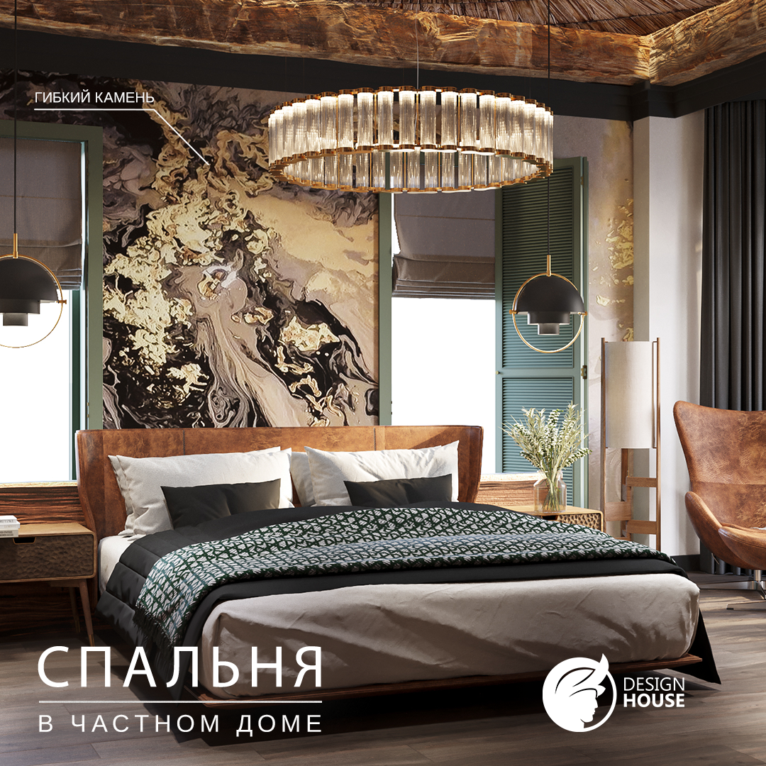 В отделке использовано много брутального дерева, на потолке деревянная черепица «Гонт». На стенке применен гибкий камень, на окнах - деревянные ставни.