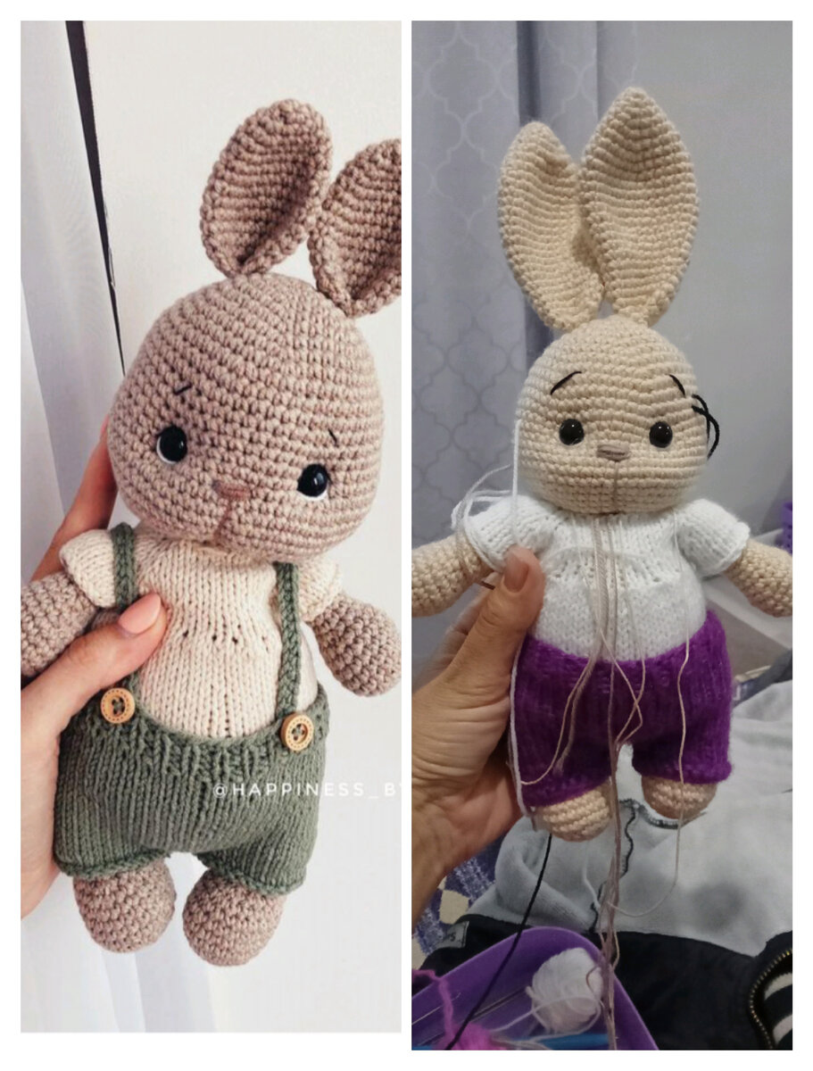 Зайка слева взят из Инстаграм. Смотрела на него и пыталась повторить. Слева это мой зайка. Вязала по своему. Сама. Не высчитывала петли у инстаграмного, просто смотрела.