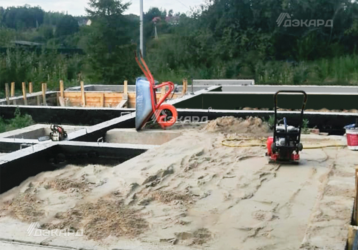 Известно, что самым надежным основанием для капитального загородного дома является монолитный фундамент. Его главным преимуществом является материал, из которого он изготавливается. Именно такое основание было подготовлено для дома из 3D каркаса в г. Коломне. Здесь был один нюанс: на пятне застройки располагался ж/б фундамент от старой постройки. Ленты, которые мешали пришлось долбить и убирать, а те ленты, что вписывались в новый фундамент, оставили внутри. Возводился фундамент в два этапа: сначала смонтировали ж/б ростверк (ленту) по буронабивным ж/б сваям, потом залили армированную монолитную плиту (цокольное перекрытие). Такой ж/б фундамент является единой цельной конструкцией, которая сама по себе имеет огромную жесткость и сопротивляемость деформациям. Монолитное основание надежно и прослужит очень долго, что выгодно отличает его от других типов фундаментов. Далее произвели обмазочную и рулонную гидроизоляцию по плите. Фундамент для строительства загородного дома по технологии 3D
