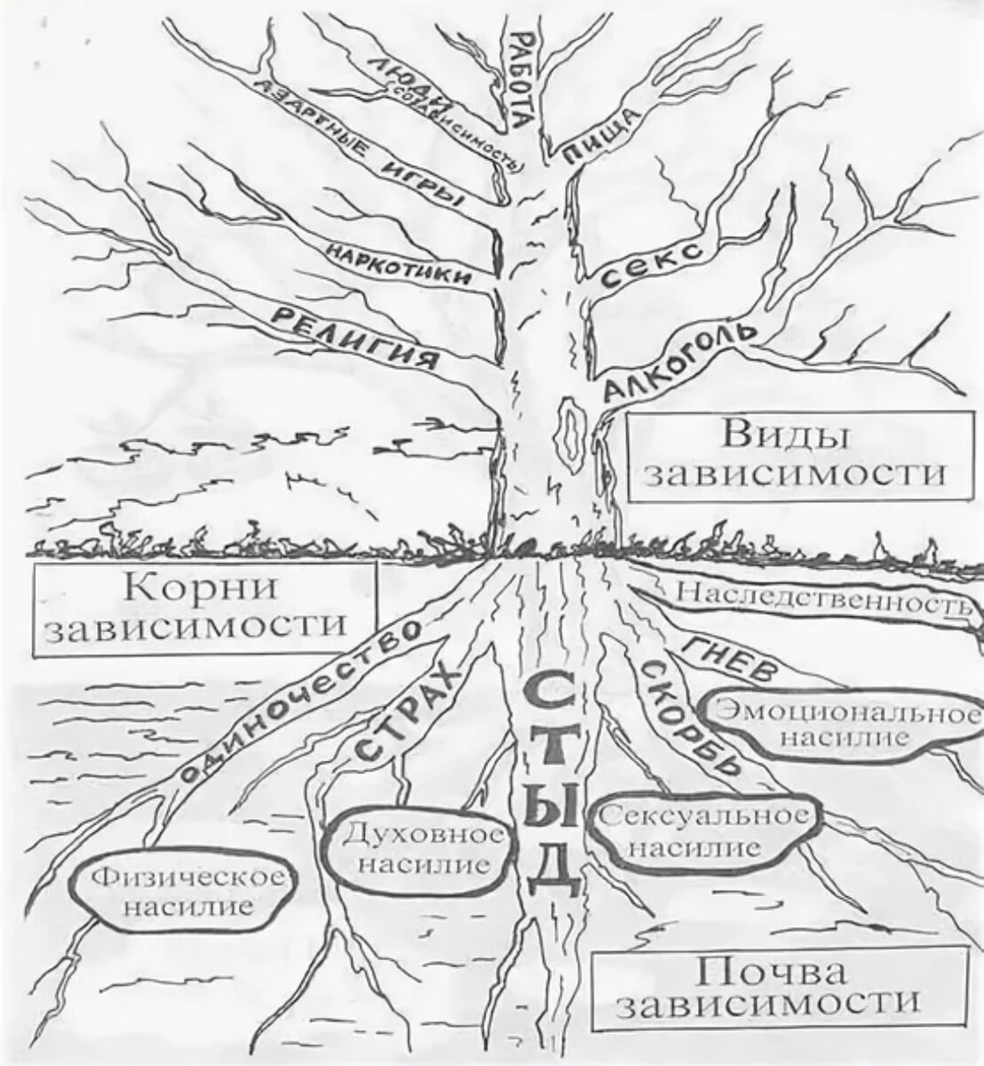 Дерево зависимости. Почва: - насилие (физическое, психологическое, социальное, сексуальное, духовное), возможно перенесенное человеком в детстве, или в отрочестве. Корни: - ложный стыд - ложное чувство вины - страх - обида - гнев Ствол: - созависимость близких и друзей, которые своим поведением питают зависимость. Ветви: - алкоголизм - наркомания - сексоголизм - трудоголизм - пищевые зависимости - религиохный фанатизм - игромания - интернет-зависимость - властолюбие - корыстность, любовь к деньгам Плоды зависимости падают с ветвей и попадают в почву, снова и снова удобряя ее. Так система становится замкнутой. Если разомкнуть эту систему - например, исключить из нее созависимость или ослабить корни (страх, гнев, обиду, ложное чувство вины или стыда) - дерево зависимости погибнет. P.S. Зависимость - невозможность управлять повседневными процессами жизни. Созависимость - компульсивное поведение, основанное на зависимости близких. 👋