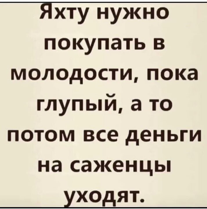 И даже дело не в яхте. Вот причапала в дом с огорода к вечеру, слегка согнутая от высадки рассады, и думаю, Господи, какое счастье, что я не на яхте, сейчас чайку попью, разогнусь, в душ схожу, в сауну, потом до кровати бы добраться и попасть на нее, не промазав, разве не счастье? Яхта, конечно, круто и красиво, закаты-рассветы, все время куда-то двигаешься, лакшери жизнь. Но это быстро надоест, ну, месяц покатаешься так, наскучит же? Допустим, на яхте тренажерный зал, можно на дорожке или велике позаниматься, ну, кино посмотреть, хотя что сейчас смотреть, ума не приложу, кроме советских фильмов. А коты? Я думаю, им на яхте было бы некомфортно, они бы нервничали. Вот только ради этого не купила бы яхту. А дома хорошо, сад-огород, все под рукой, снег, слава Богу, растаял, минуса ночью позавчера 9-го мая закончились, уже радость неимоверная, травка сразу как поперла, полдня косила, зато 14 тыс шагов, никаких вам гиподинамий, ну, зарядочку для шеи по Шишонину, на иголочках полежать, на ма