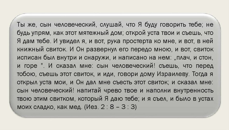 “«Ты же, сын человеческий, слушай, что Я буду говорить тебе; не будь упрям, как этот мятежный дом; открой уста твои и съешь, что Я дам тебе». И увидел я, и вот, рука простёрта ко мне, и вот — в ней книжный свиток. И Он развернул его передо мной, и вот свиток исписан был внутри и снаружи, и написано на нём: «Плач, и стон, и горе». И сказал мне: «Сын человеческий! Съешь, что перед тобой, съешь этот свиток и иди, говори дому Израилеву». Тогда я открыл уста мои, и Он дал мне съесть этот свиток, и сказал мне: «Сын человеческий! Напитай чрево твоё и наполни внутренность твою этим свитком, который Я даю тебе». И я съел, и было в устах моих сладко как мед” (Иез. 2:8–3:3).