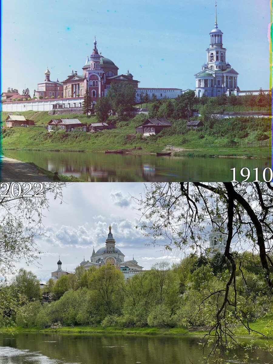 Так заросла Россия или нет? Неоднозначный ответ на этот вопрос дают фотографии Борисоглебского монастыря в Торжке. Монастырь имеет очень древнюю историю, он был основан еще в XI веке! Главное украшение обители — Борисоглебский собор, построенный в 1796 году по указу Екатерины II архитектором Николаем Львовым. Справа от собора возвышается Спасская колокольня-церковь. Её проект был также разработан Львовым, но строилась она уже Яковым Ананьевым. Также не могу не отметить красивую Свечную башню в левом углу. На ней сейчас открыта классная смотровая. В советские годы в монастыре 50 лет находилась тюрьма, затем лечебно-трудовой профилакторий для алкоголиков. Эти события негативно отразились на облике монастыря. В 1980-ые годы тут разместился историко-этнографический музей. С тех самых пор началась постепенная реставрация ансамбля. Сейчас монастырь возвращен церкви. Надеюсь, что в скором времени он будет так же прекрасно выглядеть, как во времена Прокудина-Горского. Фото взяты