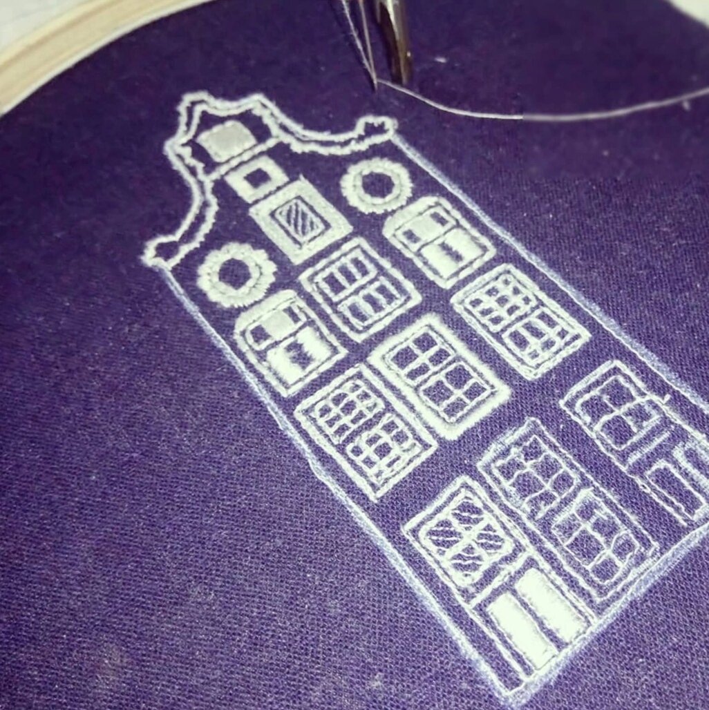 Каждую вышивку очень хочется пристроить в готовое изделие. Пряничные домики, по мотивам голландских рисунков, я вышивала в свободно-ходовой технике на старой механической машинке три года назад на плательном синем льне. Это было учебное задание на курсах по обучению машинной вышивке. Согласно заданию, домики должны были висеть на сетке (бридах, как в ришелье), но эта идея показалась мне не практичной. Сделала аппликацию на контрастном сером фоне. Льняное полотно - это неудачно купленная юбка для мамы, пролежала с этикеткой 10 лет. Максимум на что можно было рассчитывать - блуза без рукавов. Спасибо выкройкам в швейных сообществах, подобрала простой крой лифа платья в стиле 50х. Юбка-тельняшка просто собранное в складку на поясе полотно. Немного аксессуаров и моя морячка ко дню ВМФ сложилась. В планах этого года реальное платье конца 30х годов по выкройкам лучевого кроя