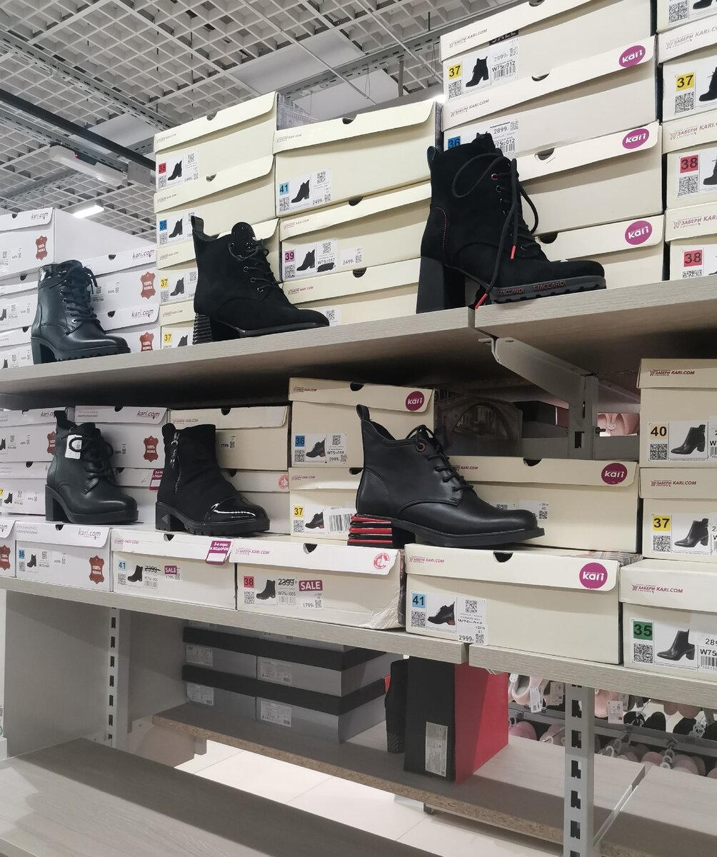 Мимо кроссовок пройти просто не смогла, к тому же ношу их каждый год. Отмечу что в "Kari" уценили многие пары обуви как из дорогого сегмента, так и из бюджетного, поэтому просматривать стоит все предложения. Я же выбрала те, что подешевле, к тому же кроссовки смотрятся неплохо, сразу вижу несколько тех, что понравились. На верхней полке обувь с желтой подошвой за 2499 рублей, чуть ниже есть кроссовки болотного цвета и серо-бело-розовые за 2199. Все эти три пары отнесла бы к наиболее удачным.