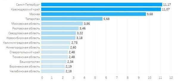 Санкт-Петербург стал лидером в рейтинге российских регионов по доле бронирования жилья для краткосрочной аренды на майские праздники. Доля Северной столицы в общем объеме бронирований составила 11,17%, следует из исследования (есть у редакции) сервиса «Авито Недвижимость», где проанализировано число обращений за контактами собственника на платформе. Второе место занял Краснодарский край с показателем 11,07%, на третьем месте — Москва (9,68%). В первую пятерку рейтинга вошли также Татарстан (5,68%) и Подмосковье (3,86%). Самые популярные регионы для краткосрочной аренды жилья на майские праздники в 2023 году Данные: «Авито Недвижимость» По данным «Авито Недвижимости», самыми активными путешественниками в эти майские праздники стали москвичи. Наиболее часто они бронировали на платформе квартиры для посуточного проживания в Санкт-Петербурге, Московской области, Краснодарском крае, Калининградской области и Татарстане. В пятерку самых популярных маршрутов для внутреннего туризма среди поль