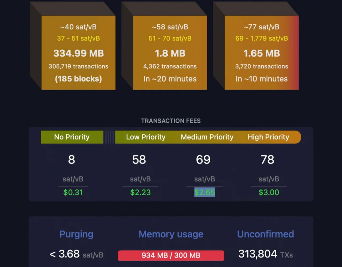 Заторы в сети биткоина начали рассасываться, а комиссии за транзакции снизились на 90%. 8 мая сеть была перегружена более чем 500 000 неподтвержденных транзакций, что привело к образованию значительного узкого места. Однако по мере увеличения комиссии за перевод до 30 долларов и выше, пробка автоматически рассосалась, что привело к значительному снижению комиссии, которая теперь составляет менее 3 долларов.
