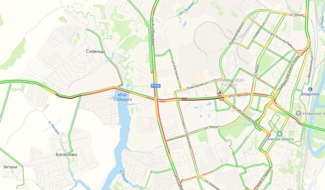 Огромная пробка и на въезд в город со стороны Нижнего Новгорода. В Боголюбовово пробка растянулась от станции Лемешки до улицы Северной.