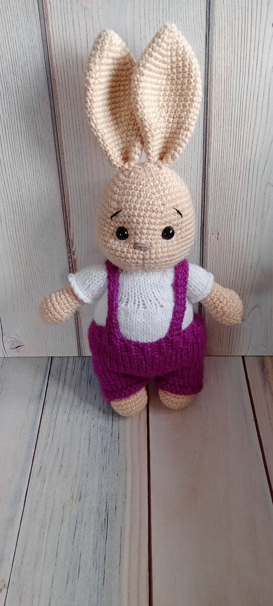Ну, вот и готов мой зайчик. Методом проб и ошибок заяц готов. Времени у меня у мало бывает на вязалки. Поэтому то и растянула этот процесс почти на три недели. За основу техники вязания брала самую простую схему. У кого то смотрела МК. Записала в тетрадь. А этого зайца подгоняли под свои запросы и желания. И вот итог. С первого раза, даже ни разу не распустив я связала все детали. Но когда я начала формировать мордочку, это капец какой-то. Получался какой то лягушонок🤦 Да и когда соединяла голову с туловищем, она всё время была набок. Ну, то есть лицевая часть , как бы я её не закрепляла иголками, когда начинала сшивать и подходить уже к концу, голова смотрит в бок. И так три!!!! Три раза я её перешивала😂 Я уже и шептала нехорошие слова😁 Ну вот он и готов. Мне нравится. Сейчас вяжу второго, так как мне заказала двух зайчишек, только одежда будет отличаться цветом.